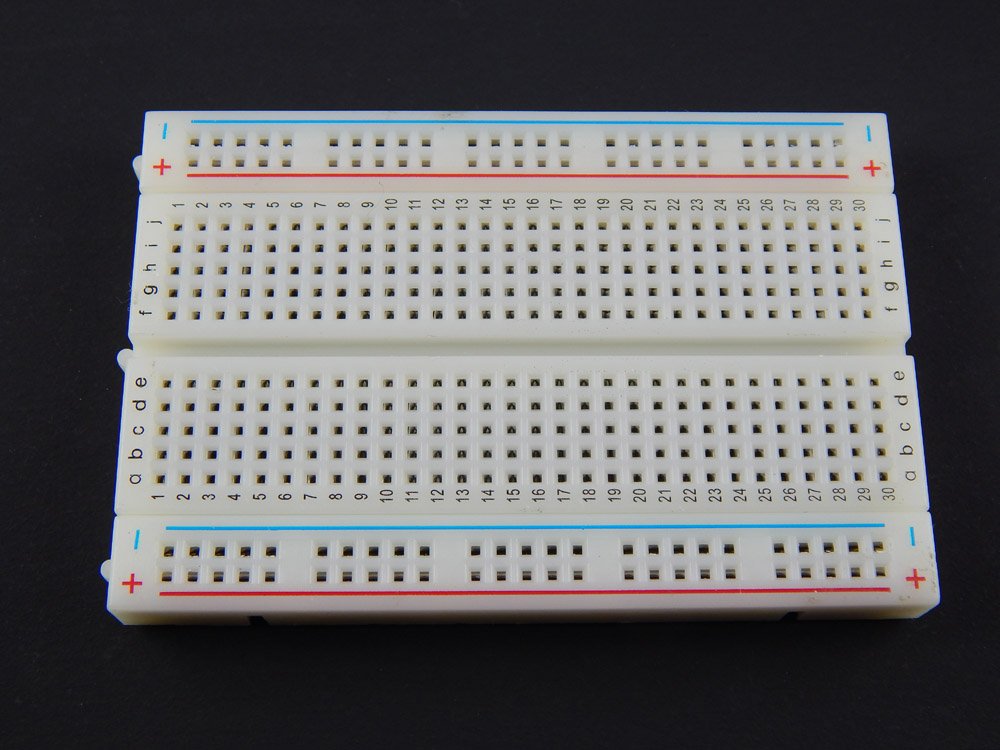 Solderless Breadboard withh 400 tie point. It has 2 power buses, 10 columns, and 30 rows. All pins are spaced by a standard 0.1". The two sets of five columns are separated by about 0.3", perfect for straddling a DIP package over. The board accepts wire sizes in the range of 29-20AWG.